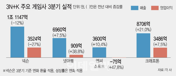 3N+K 3분기, 넷마블·크래프톤 웃고 넥슨·엔씨 '숨고르기'