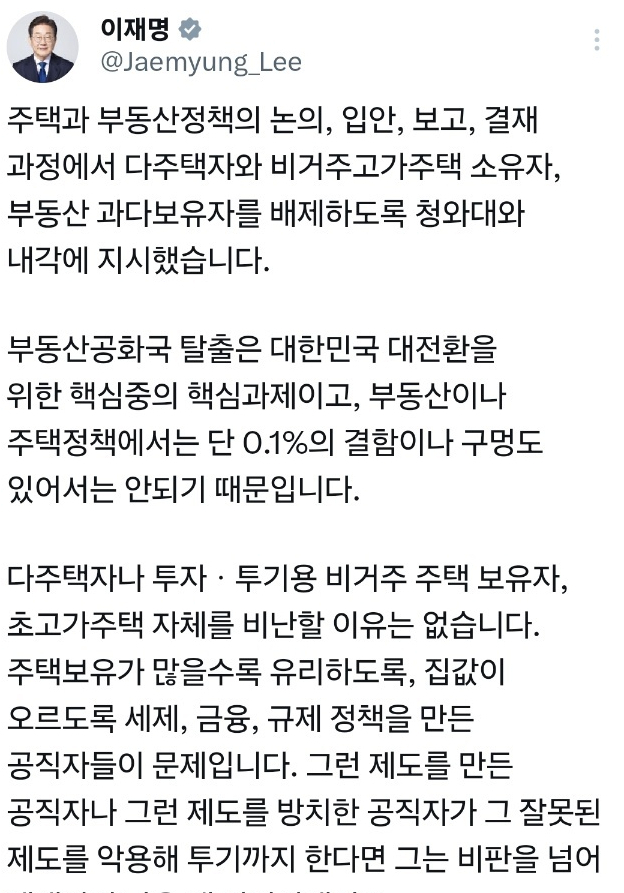 [연합뉴스TV] [속보] 이대통령 "부동산정책 입안 등 다주택자 배제" |
